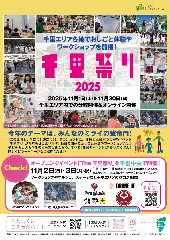 千里祭りは、地域の事業者や団体、大学などが「このまちと、学ぼう!遊ぼう‼」をコンセプトに11月1日(土)~11月30日(日)をコア期間に千里エリア各地とオンラインでお仕事体験やワークショップなどを開催いたします。