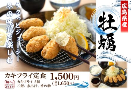 広島県産の牡蠣を使用したサクサクでジューシーなカキフライに、タルタルソースをたっぷりかけてお召し上がりいただけます。冬の味覚を是非この機会にお楽しみ下さい♪