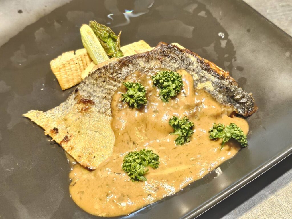 スズキを香ばしくソテー、ポルチーニ香るソースで。
